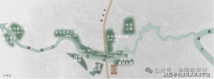 绿意栖居专属城市公园半径:毗邻哈密公园,风铃绿地、半马苏河岸线一期(在建中)及二期、苏州河景观长廊在侧,河岸漫步生活,城市自然回归。(*距离数据来源于百度地图测量)