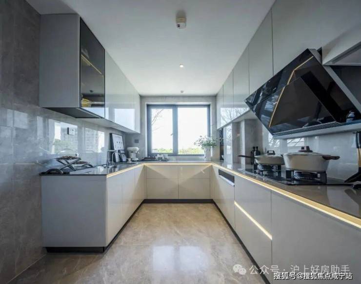 U型厨房:厨房采用U型布局,并巧妙融入飘窗元素,拓宽视野同时增添休闲氛围。