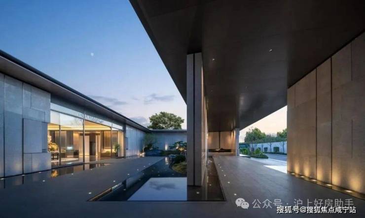 而人行线路则由星级酒店式的入户大堂进入,接着便是6S会所环绕的下沉式水景庭院,7米高磅礴大气的跌水景墙配合三棵参天乌桕林和原石、浮桥交错的地面水景,若是傍晚归家,还能欣赏倒映在水中的点点星光,可谓满满的奢雅意境和尊贵仪式感!