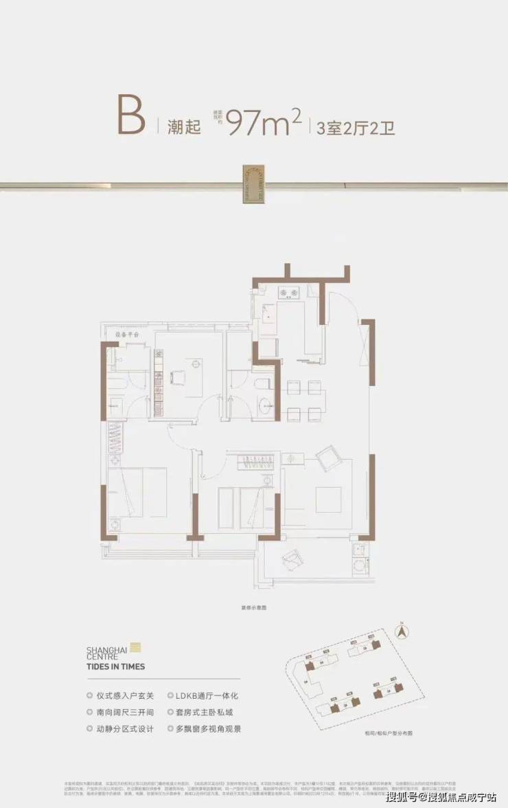「涌潮府」售楼处电话:400-960-1656 建面约95-97㎡3房2卫,户型3开间朝南+T字动线+动静分离,主卧也设计了套房,让室内采光、通风、私密性都做了进一步升级。
