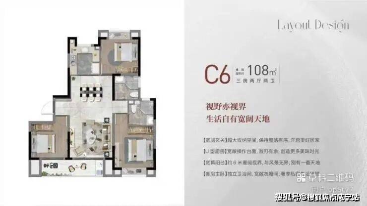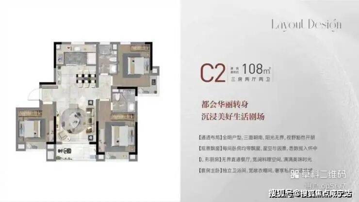 108㎡3房2厅2卫:实现主卧套房+双阳台,做到了三开间朝南+双阳台设计+主卧套房设计+南北通透。客餐厅一体化,无过道设计,大大提升了空间利用率;主卧套房带独立卫生间和飘窗,东西侧卧室让三代同堂家庭生活互不打扰1。