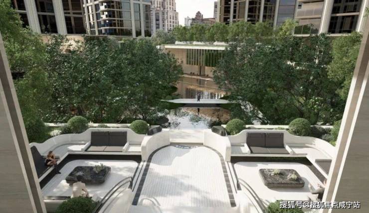 穿过园林,上海最大的约3500㎡下沉水院构成社区的核心灵魂,约13米的高差形成独特的“峡谷绿洲”,将黄浦江的水意象引入社区,中央平静水面与四周的会客舱、茶室、游泳馆形成呼应。
