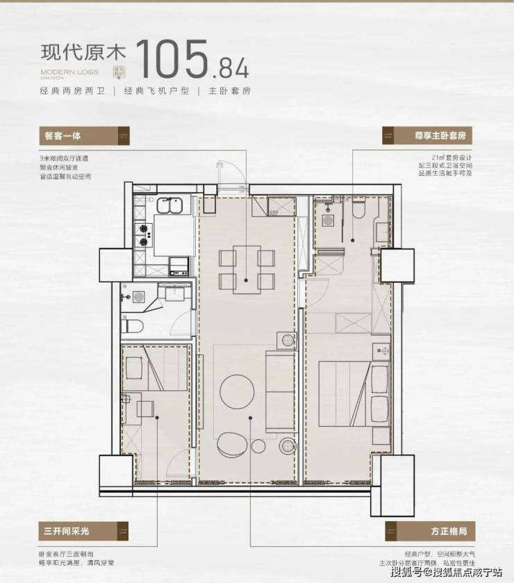 105㎡两房:南向双阳台,主卧套房带衣帽间,U 型厨房可容纳双开门冰箱。