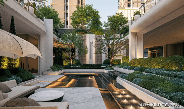 这条连廊不仅是遮风避雨的通道,其下方架空层打造的一座与景观交融的下沉式庭院会所,兼具东方隐逸美学与现代社交功能。