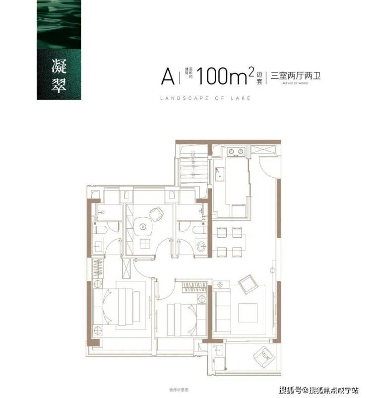 建面约100㎡3房2厅2卫,做到了三开间朝南+主卧套房设计+动静分离+全卧室带飘窗,功能性和尺度感完美结合的3房户型。