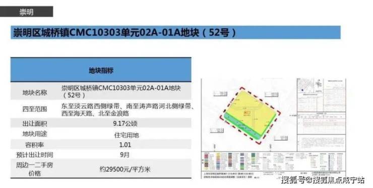 2020年10月10日,崇明区陈家镇CMSA0008单元17-01(实验生态社区37号)地块开拍,据悉,报名房企分别是:中粮,路劲,星河,保利地产,万达。最终,地块被路劲以总价10.04亿元,溢价率10.4%,成交楼板价12701元/㎡竞得。