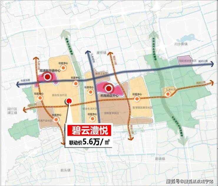 而附近的科南地区中心是上海商业空间规划的45个地区级商业中心之一,未来拟建约250米高双子塔与张江北部约320米高的科学之门形成南北呼应格局。