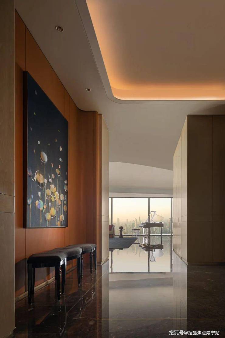 走道端处香槟色金属雕塑,形类城市高楼,又若恋人彼此依偎;全采光套房拥揽白日上海黄浦的忙碌、繁华,也收藏夜晚灯火阑珊的宁静、美好。
