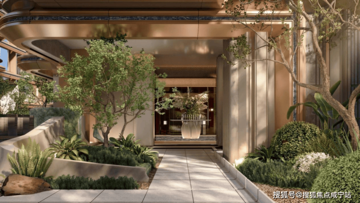 项目还规划了下沉式庭院,搭配叠水、绿植,形成立体景观。在滨江这种地段,愿意把土地拿出来做景观,本身就是一个态度。