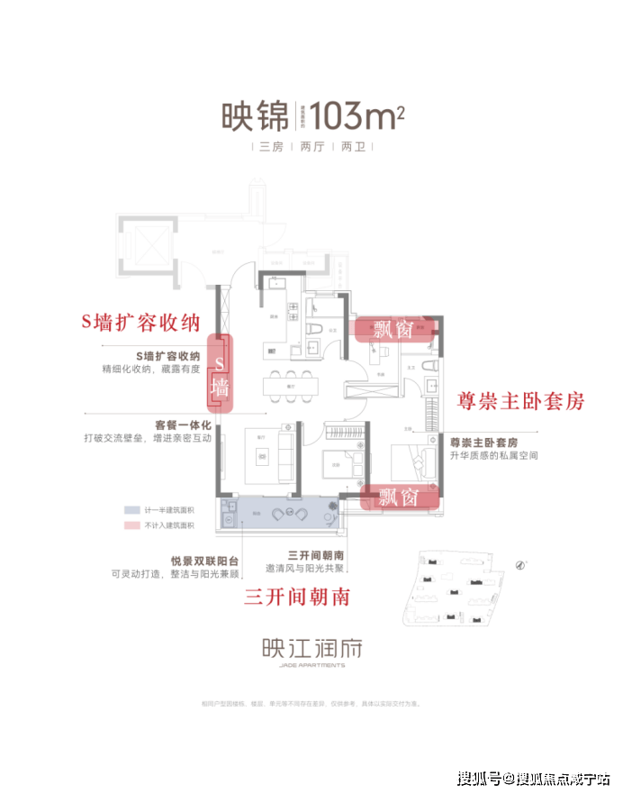 :三开间朝南+双飘窗全赠送,实得面积堪比95㎡竞品;创新S墙设计释放1.2㎡收纳空间,冰箱外置提升通透性。