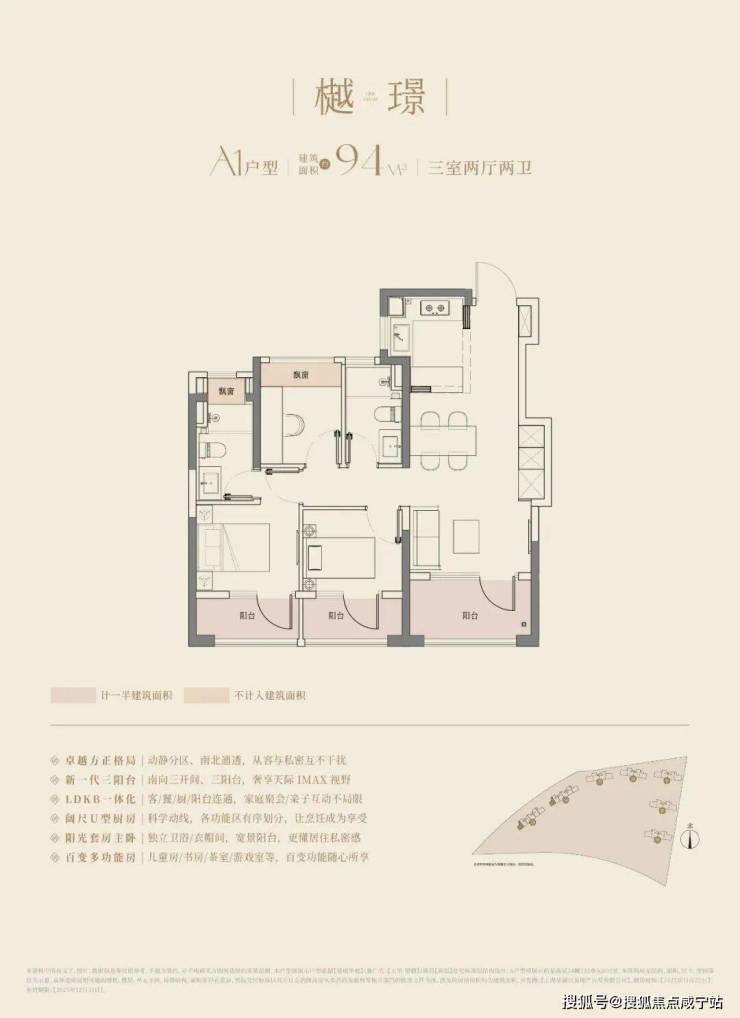 大华望樾建面约94㎡高层户型居然做到了三阳台的配置,远远超过新规标准。