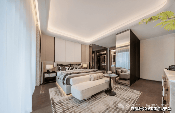 主卧套房以黄金比例精筑约35㎡「环形生活舱」,整合睡眠区、独立衣帽间、星光浴缸及观景露台,通透玻璃幕墙引晨曦星辉入室,让自然成日常背景乐,真正诠释「生活即高定」的奢居理念.