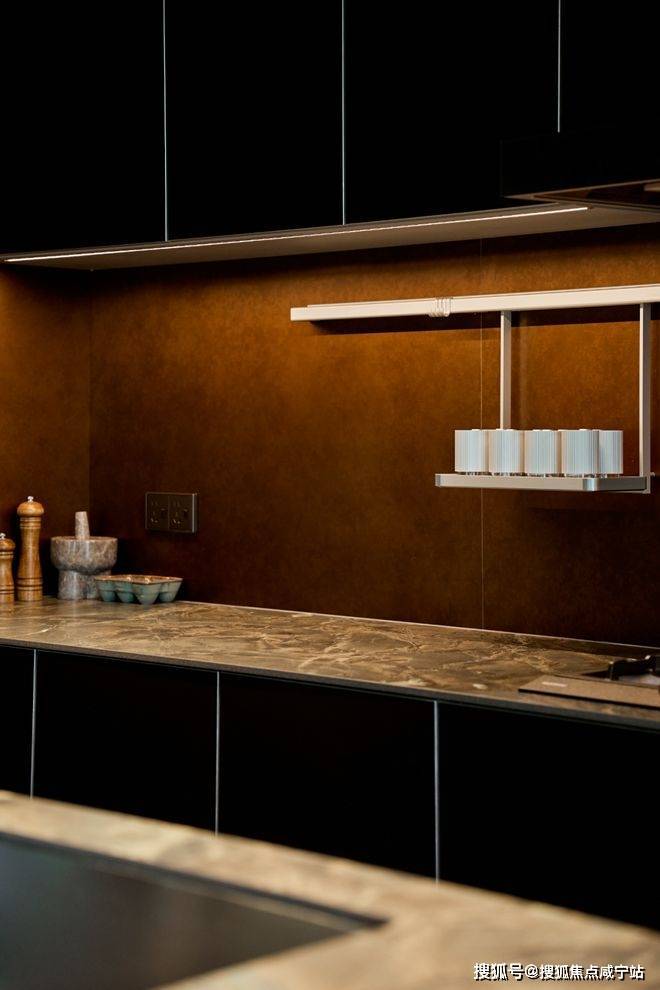 西厨岛台选用亚马逊绿大理石纹岩板打造,搭配金属质感推拉门高审美艺术性表现力满分!