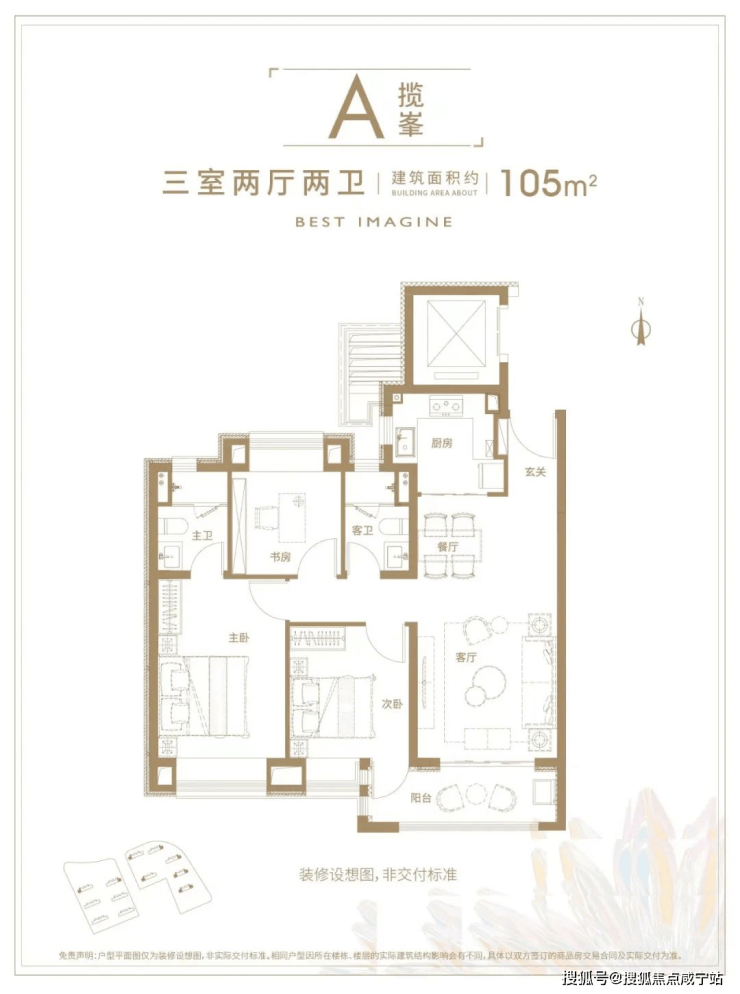105㎡三房两厅两卫:南北通透,U型厨房操作高效,主卧套房设计搭配飘窗,空间利用率高。