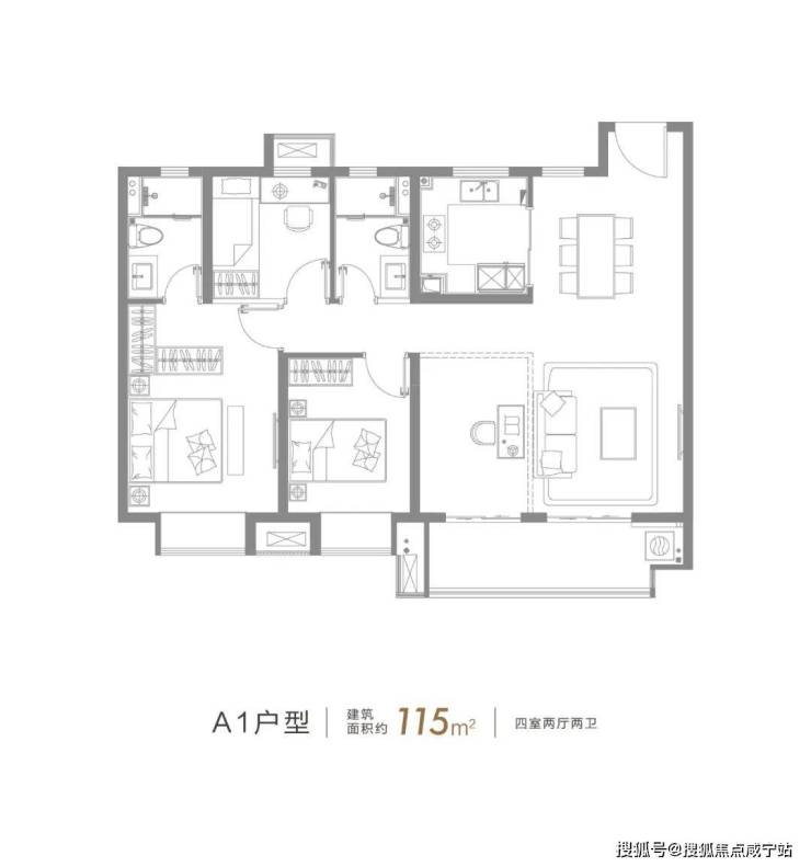 建面约115㎡的4房2厅2卫户型,超大面宽南向阳台、整体南北通透、主卧套房的设计,这个户型实现了多数人对于未来生活的期待。