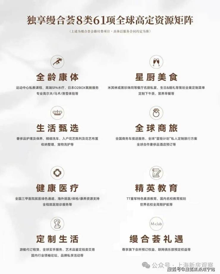 沿袭华府会的国际化运营理念与成功经验,项目已引入同一个运营团队“缦合荟”进行生活方式前置运营,规划社交、商务、运动、志趣、亲子5大主题,并链接8类61项全球顶级资源,包含精致私宴、恒温泳池、健身房、儿童体适能、茶室、多功能厅等