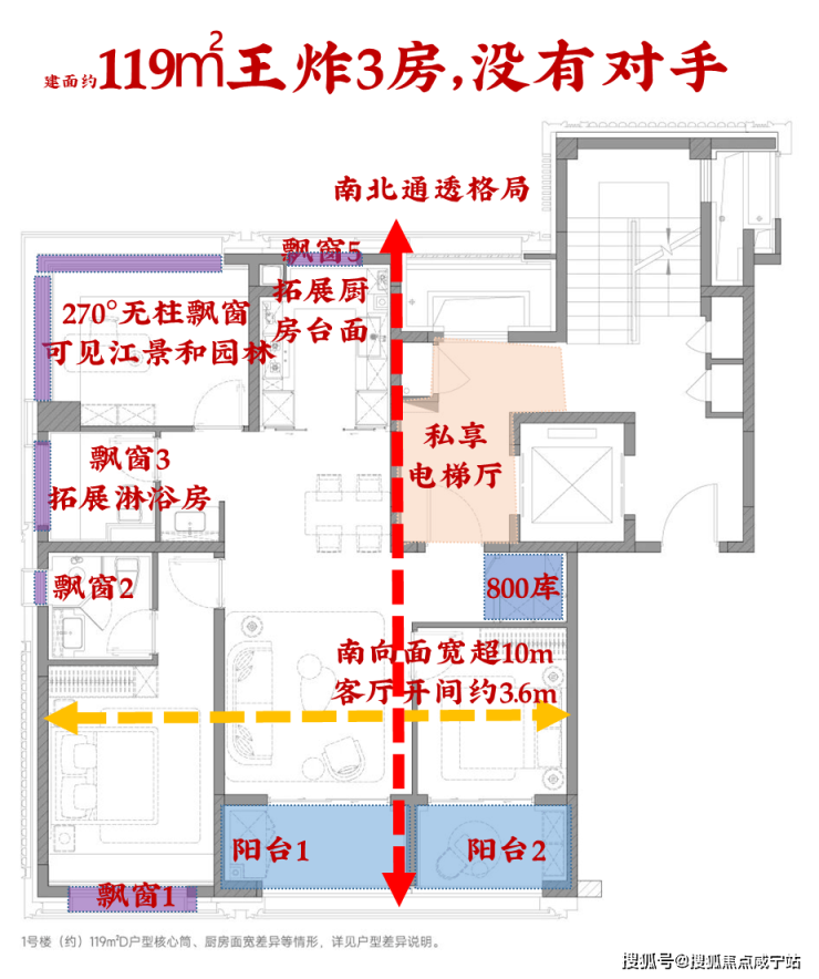 加上2个卧室都带270°转角大飘窗,整个室内的通透性和景观视野放到最大,这几乎是大平层才有的待遇!