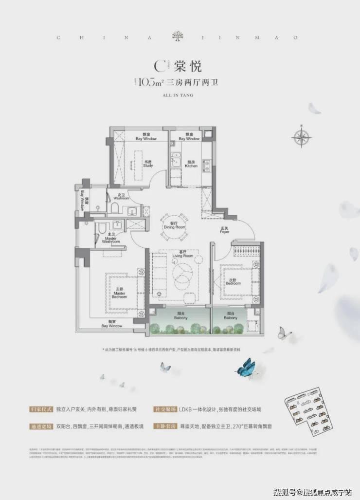 三开间朝南+5个飘窗+主卧套房设计+270°转角飘窗,较105㎡来说,居住体验、舒适度、尺度感更大!