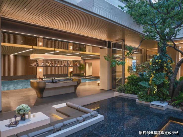 奢华度假式的恒温泳池,一整面落地玻璃面向中央下沉庭院,吸收自然采光的同时,也可以欣赏庭院美景!