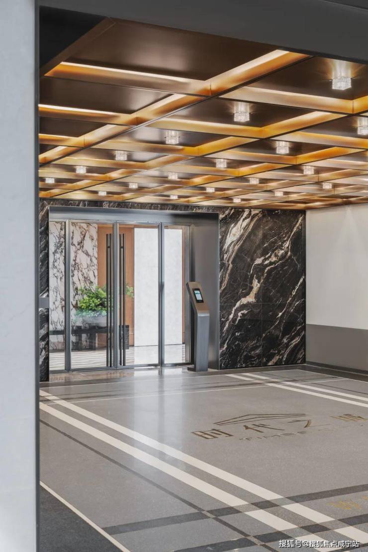 用料上,部分以冰火板+岩板打造的车行道廊柱、仿透光云石定制车牌号、部分主干道全铝板吊顶,无不显示出业主的归家气场。