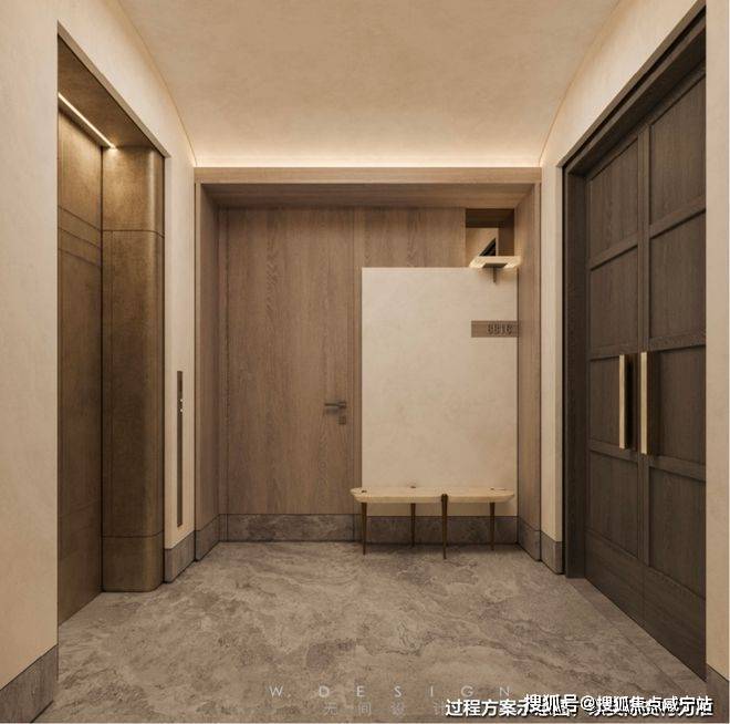 公区则由无间设计,以电梯间为例,圆弧吊顶、浮雕门牌,还有奢石打造的小壁龛,可以放点私人订制化的小物件,比如样板间现在放了一个麒麟雕像。