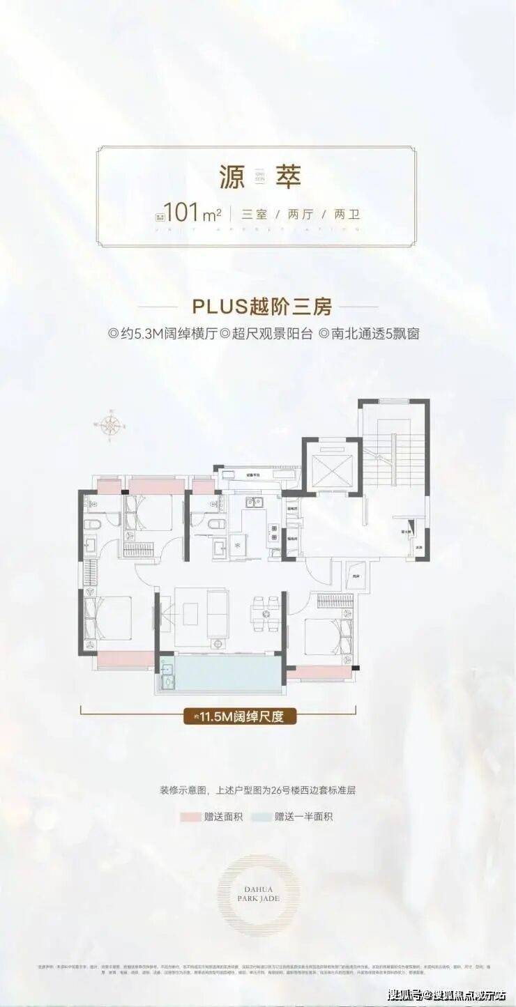 经典飞机户型+三开间朝南+餐客厨一体化+约5.3m的阔绰横厅,整体南向面宽达到约11.5m!整个户型的通透度和采光度很棒。