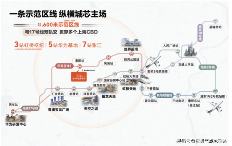 而示范区线(在建)左手长三角一体化、华为,右手前湾、大虹桥总部商办,并通过虹桥枢纽,串联2号线及正在试运营的机场联络线,把市中心、徐汇、闵行、张江等高能板块都纳入保利虹桥和颂·IN255的通勤版图。
