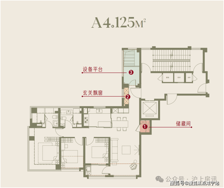 南向面宽达13.4m,四开间朝南,全卧超南。实得率超95%,多了20平空间,三阳台,满飘窗,设备平台,主卧室270°套间设计。层高3.15米。这个户型对比样板房,储藏间更大了,玄关收纳空间更大,收纳空间更多