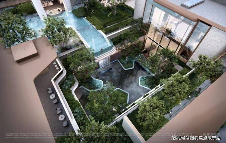 •下沉峡谷:约420㎡丰富层次立体下沉庭院,区域首现悬浮水池,搭配4.3米飞瀑,塑造沉浸式度假感受。