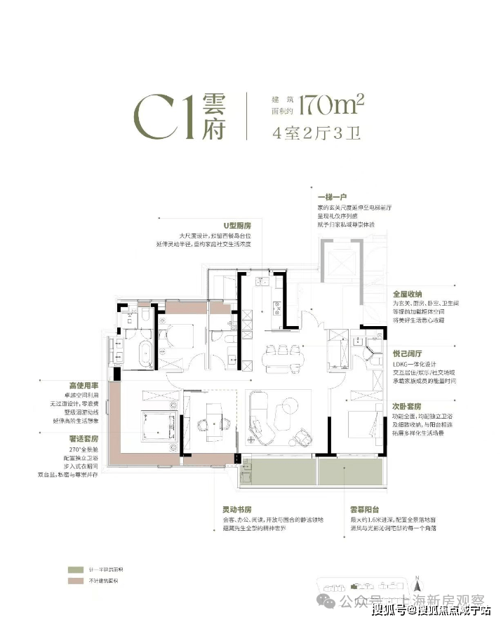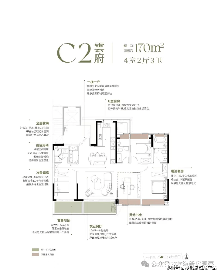 随后推出的 170㎡“悬浮全景舱”,直接引领上海高端户型革新—— 南向 15.8 米四面宽让每个空间都享阳光平权,深 U 型厨房预留西厨岛台,约8.35 米双阳台兼顾功能与情绪价值,双套房 + 270° 全景窗 + 三卫设计,更将 “新平权主义” 落到实处,让每位家庭成员都有私密空间;