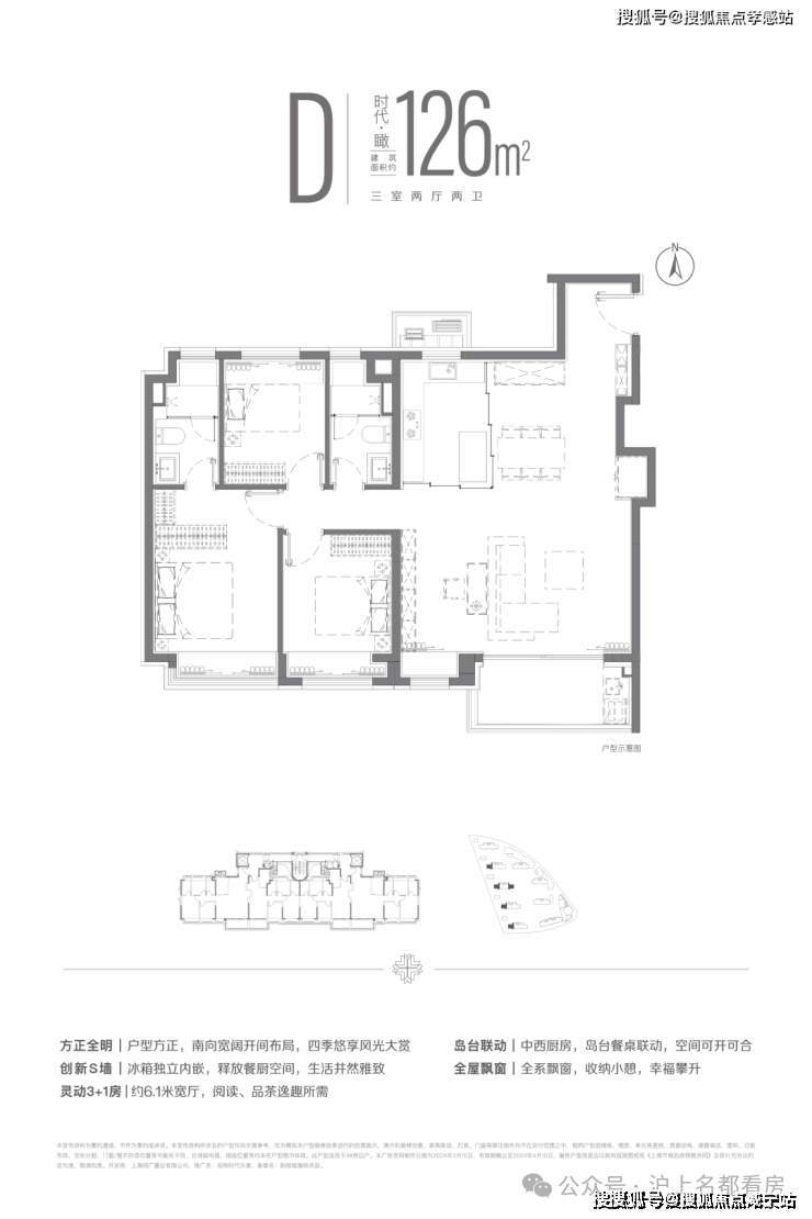 建面约126m²三房两厅两卫户型,南向3+1面宽横厅设计,让空间更加随心而变。主卧双台盆配置,用空间拥抱自然中的无限自在。