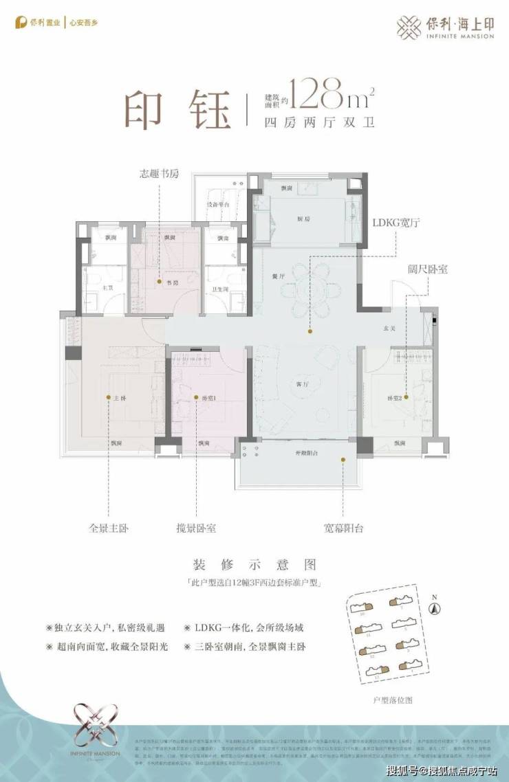 保利·海上印售楼处电话☎:400-880-0703(预约热线)✔✔✔建面约108㎡3房2厅2卫,该户型为经典的动静分离户型,三开间朝南,预留分户S墙设计,客厅面宽约4.85米,边套户型主卧为270°转角飘窗。