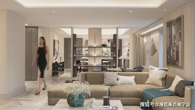 会客空间约有50平,餐客厅一体化足足有近百平,尺度感超强。