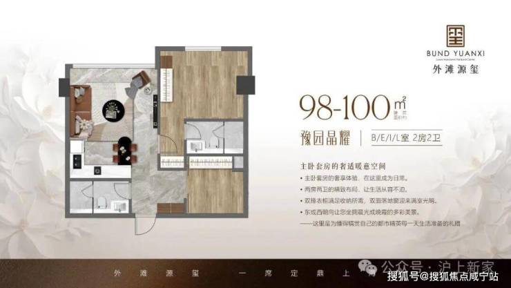 180㎡三房:三开间朝南,主卧套房带独立衣帽间与双台盆卫浴,270°弧形阳台俯瞰苏州河;