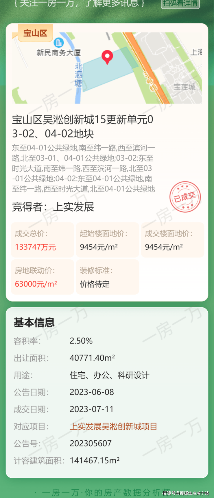 2023年7月11日,上海第二批次2轮土拍中,上实以总价133747万元成交宝山区吴淞创新城15更新单元03-02、04-02地块,地块出让面积40771.4㎡,容积率03-02:2.5;04-02:4.0。溢价率0%,楼板价9454元/㎡,房地联动价63000元/㎡。