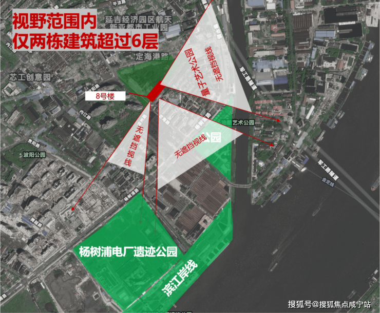保利誉滨江踞于杨浦滨江亲江位置,距黄浦江岸仅约500米(数据来源于百度地图直线测距)。而8号楼,更位于整个社区的南侧,靠近黄浦江,南侧无高层楼栋,整体视野非常开阔,从复兴岛到黄浦江视野,几乎无遮挡。