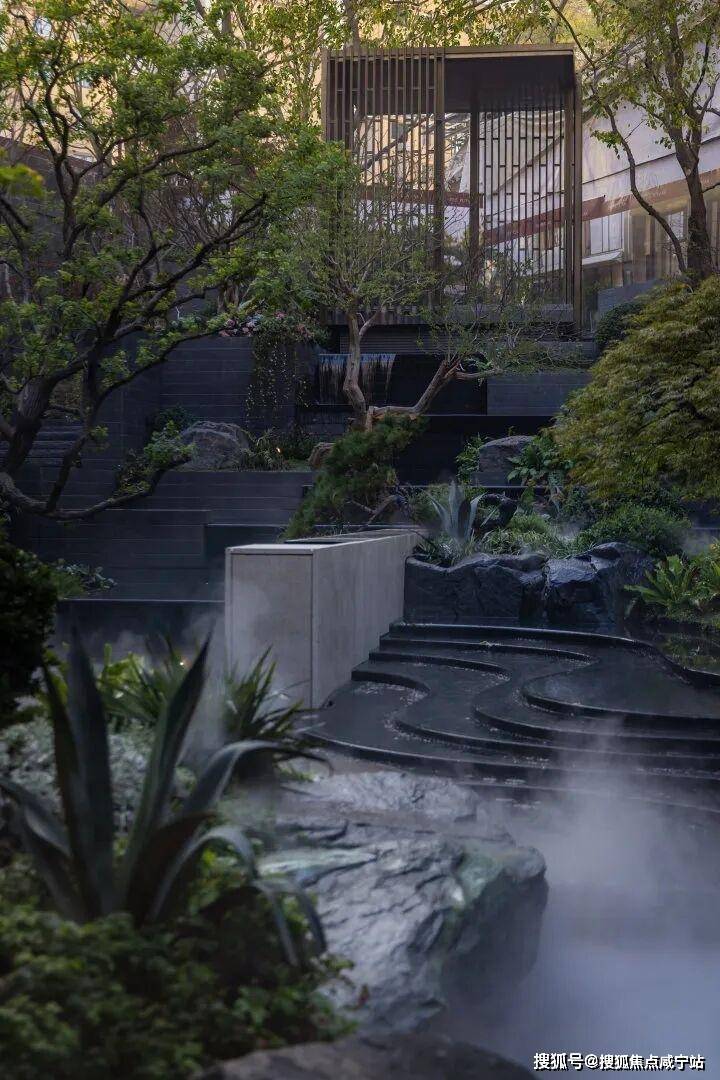 林涧溪谷:以300㎡镜面水为核心,周围环绕叠级景观,水面如镜子般倒映着天空、绿植与石材,分不清哪里是实景,哪里是倒影。