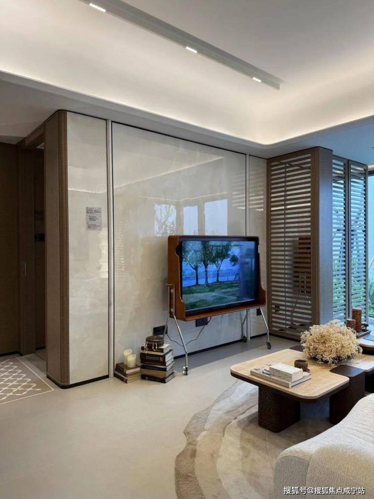 约5米面宽横厅,多出来一个灵动空间,可根据个人需求定制为开放式书房、茶室等;岩板+金属饰面电视背景墙同样为交付标准;