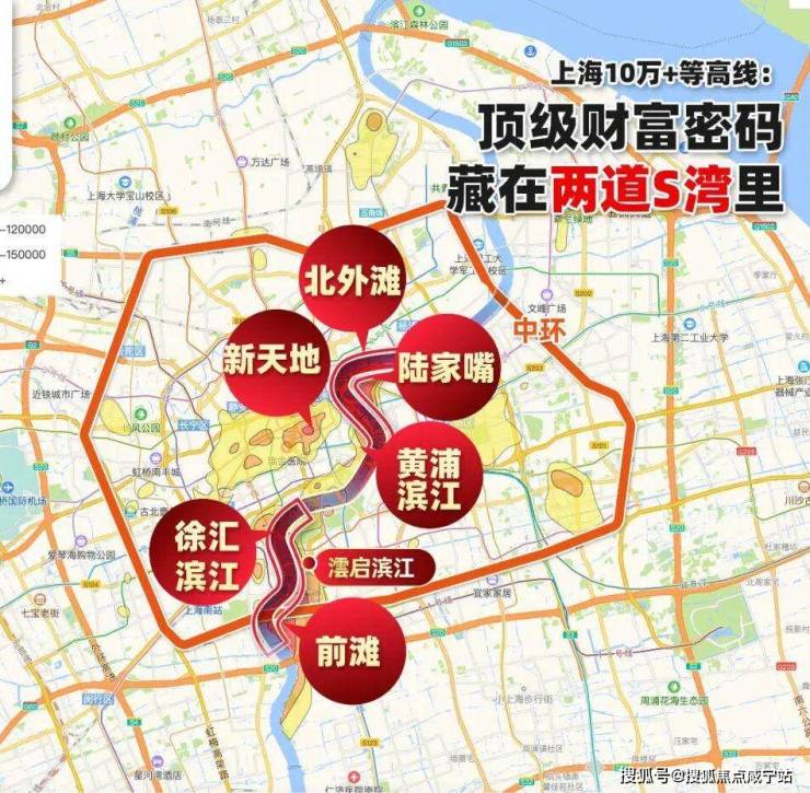 其实,从一房一万房价等高线上就可以看出,上海10万+房价高地基本都缠绕在两道S湾上。