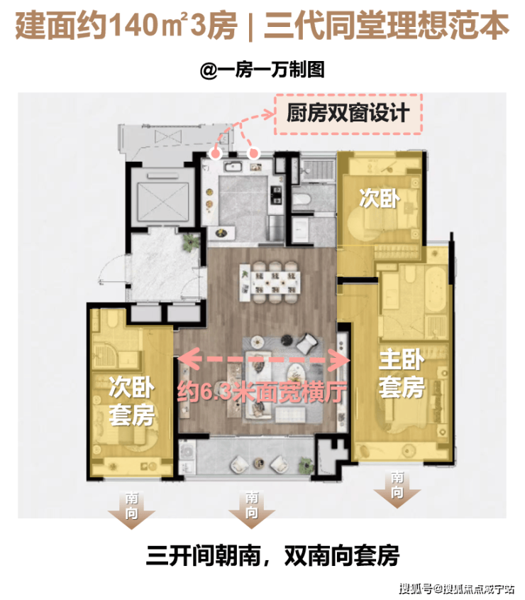 建面约140㎡户型,不仅仅是三开间朝南,更做到了双南向套房设计,以阳光为笔,勾勒出更尊崇、更有隐私性的休憩空间,充分满足当代居住需求。