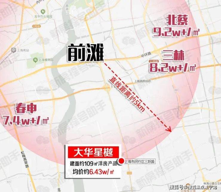 另外,同样在距离前滩约5km范围内,浦东新房价格明显高于闵行:北蔡板块的新房均价约9.2w/㎡以上、三林板块新房均价也达到了8.2w/㎡,而位于闵行区浦锦街道的「大华星樾」均价仅约6.43w/㎡,性价比优势突显!