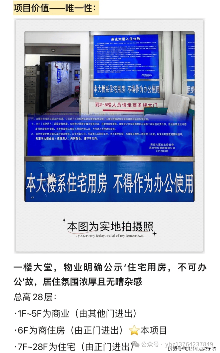 一楼大堂,物业明确公示‘住宅用房,不可办公’故居住氛围浓厚且无嘈杂感