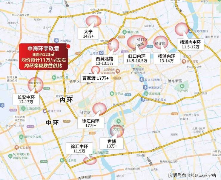 内环内新房普遍12万+/㎡,静安曹家渡约17万+/㎡、虹口14.5-16.5万/㎡;内中环如大宁14万+/㎡、长宁中环旁12-13万/㎡、浦东世博13万+/㎡。