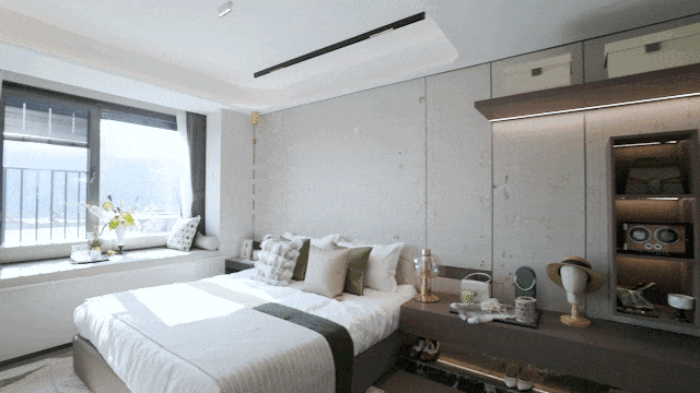 大尺度飘窗,不管是卫生间还是房间,主打就是通透和舒服。可以做梳妆台,也可以作为一个喝茶小憩空间,因为每个飘窗足够大,所以它还可以根据主人的喜好变成任意新的拓展空间。