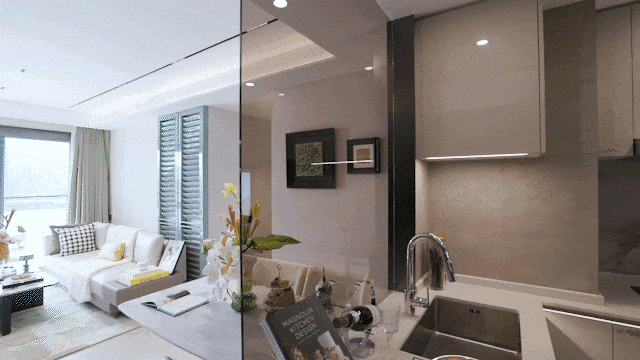 样板间的玄关、会客厅、厨房移门、卫生间等空间使用白雪公主玉石、宝格丽奢石、普拉达绿奢石、水波纹奢境、流光纹奢板等行业高端产品标准用材。