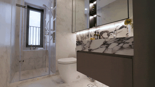 定制通顶款无框淋浴房,外观简洁通透,消除空间割裂感,符合现代年轻人的审美。设计线性浴霸,让吊顶更具有设计感,同时人性化考虑,安装位置合理,保证室内空间均匀取暖。参考五星级酒店化工艺隐藏地漏做法,打造精致美感。