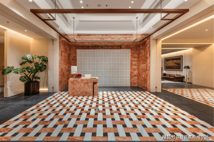 实景中,地面采用了天然石材的拼花工艺,不同色调的石材精准对缝,形成简洁而富有层次的几何图案,彰显低调的仪式感。