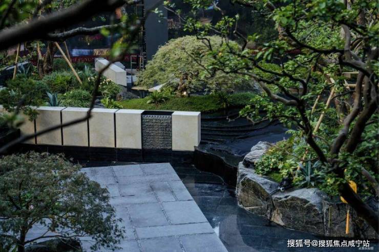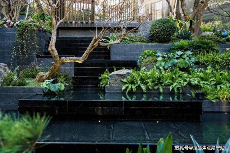 随形就势,流水从近7米的跌水台层层落下,每一层营造不同绿植场景