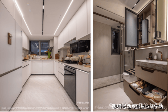 设计深度贴合日常需求,让精装不止于“豪”更在于“舒”。厨房采用人体工学高低台布局,烹饪区低于水槽区,契合手臂自然下垂的舒适角度,让烹饪动作行云流水,大幅减轻家务疲劳。更精准捕捉女性需求,卫生间专门配备 科勒美妆龙头、美 妆镜柜、美妆冰箱,搭配“顶+面双补光照明”,将“女本位”关怀落到细节,这般细致在同类项目中实属难得。
