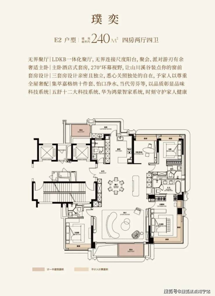 建面约240㎡户型是经典南北通结构,客餐厨总面积超90㎡;